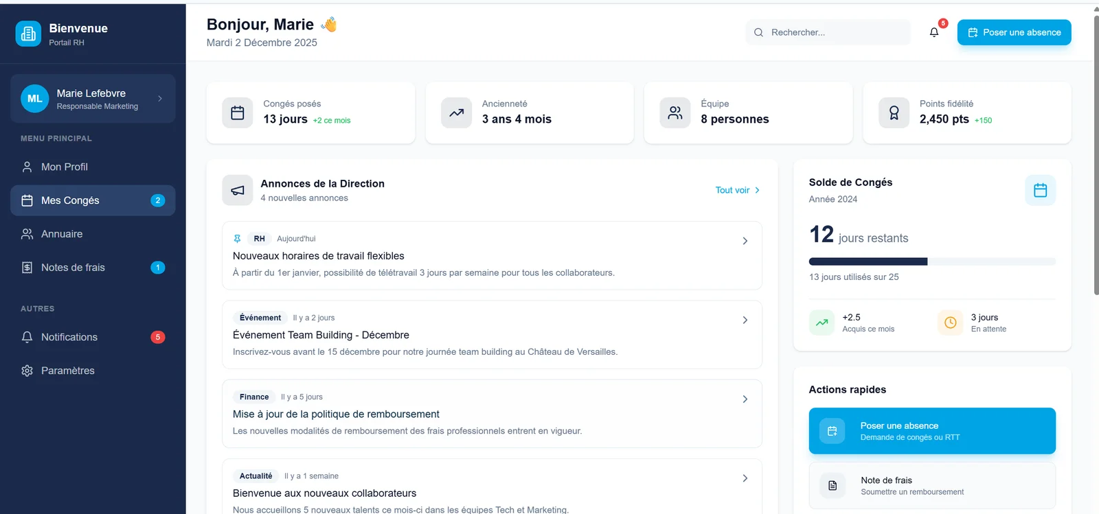Un portail RH interne pour centraliser congés, annonces, documents et actions rapides. Les salariés ont tout au même endroit.