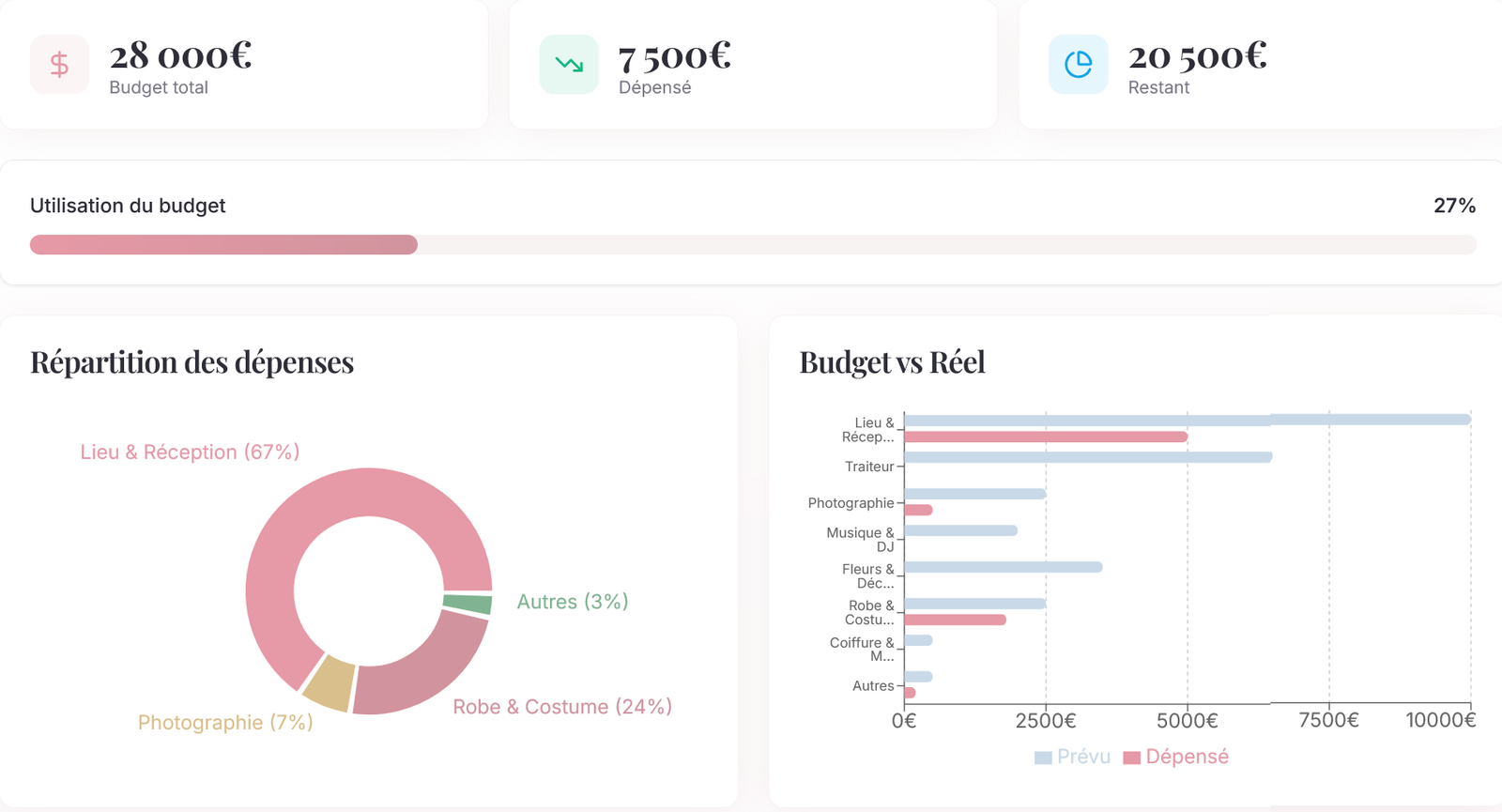 Suivi complet de chaque événement : prestataires, budget, tâches et planning. Le client suit l’avancement en temps réel.