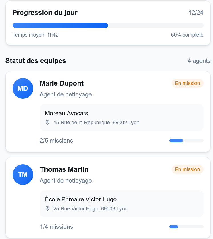 Suivi des agents en mission, pointage géolocalisé, photos avant/après et rapports clients générés en un clic.